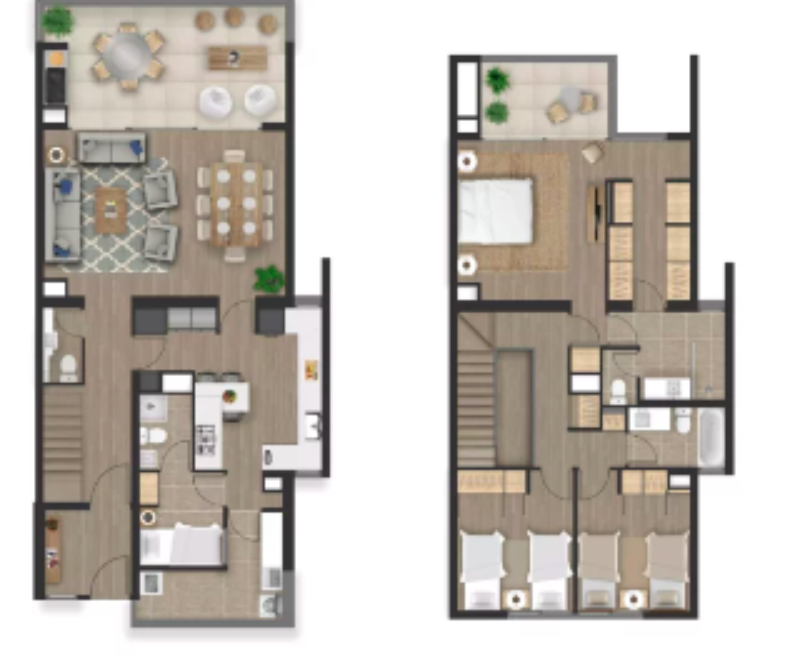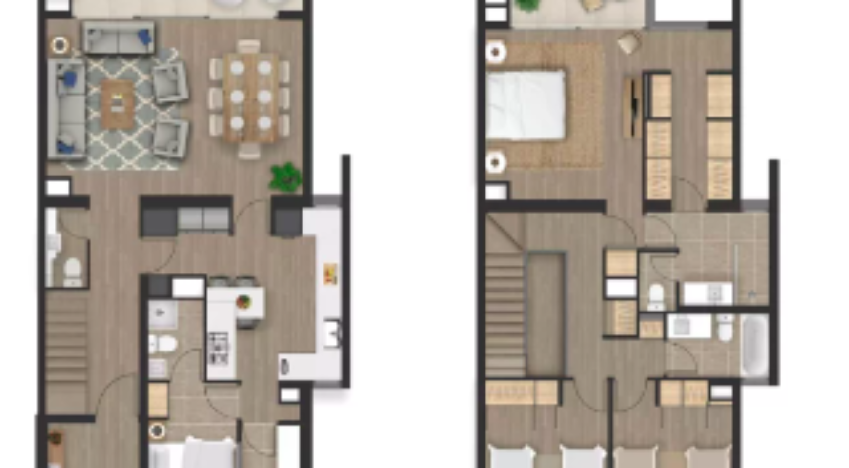 Segundo Piso: Dormitorio principal en suite, amplio walking closet, terraza, 2 dormitorios, baño.