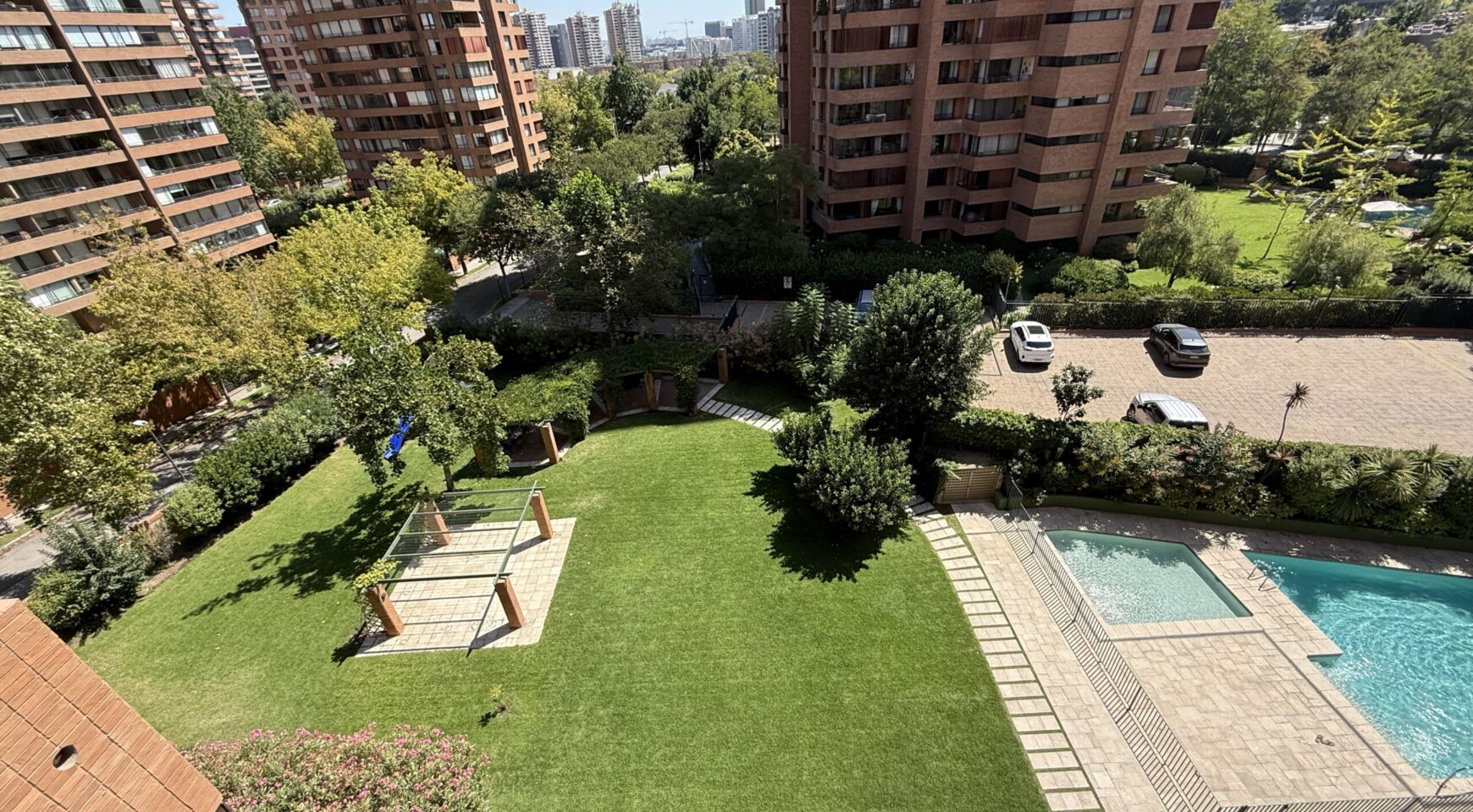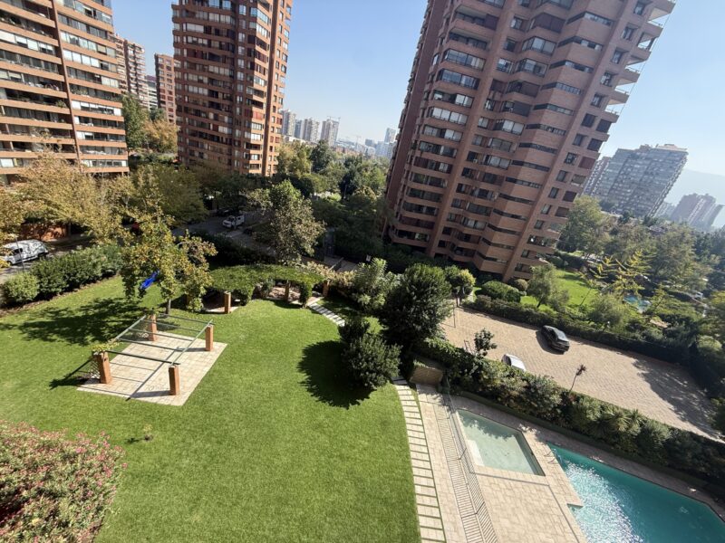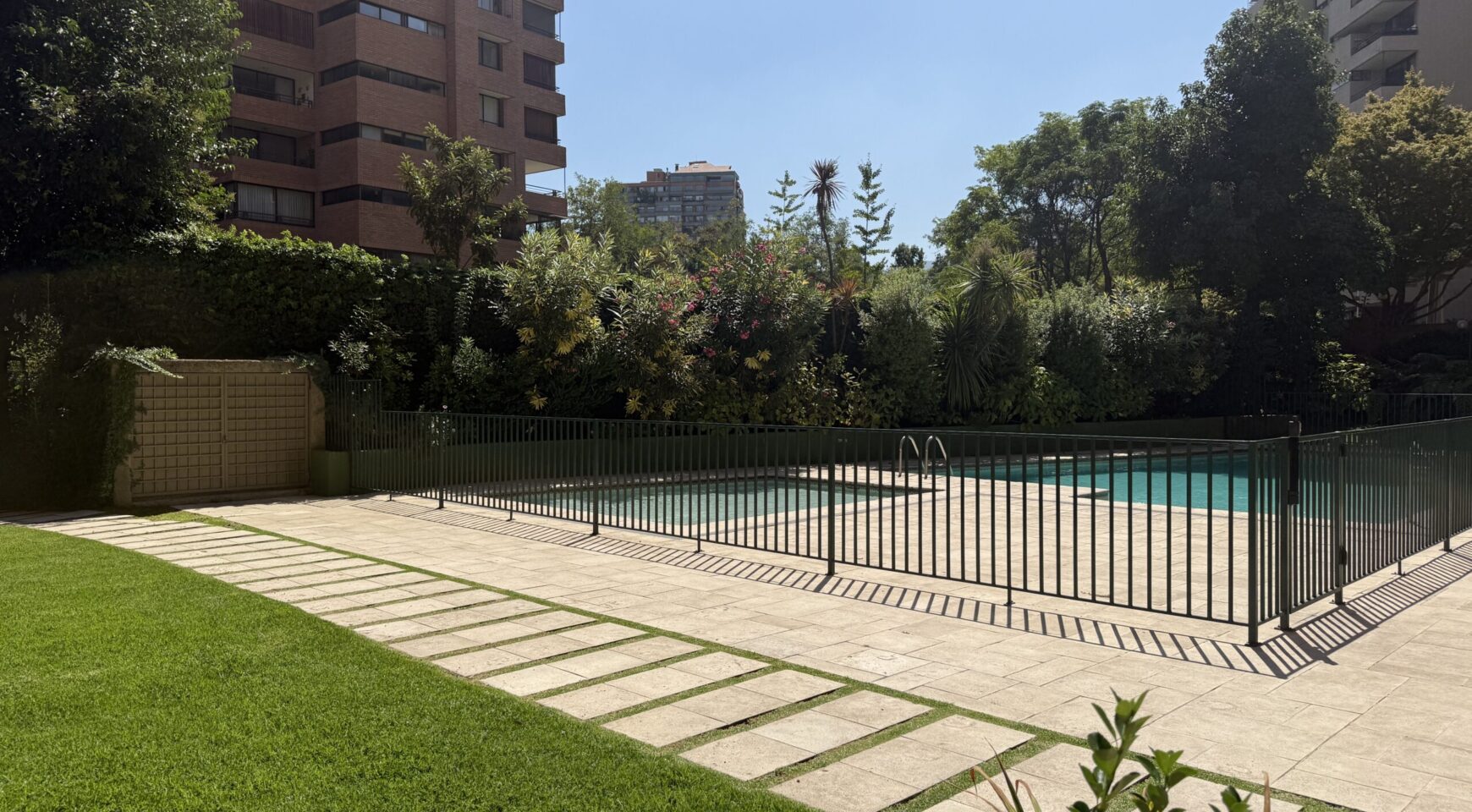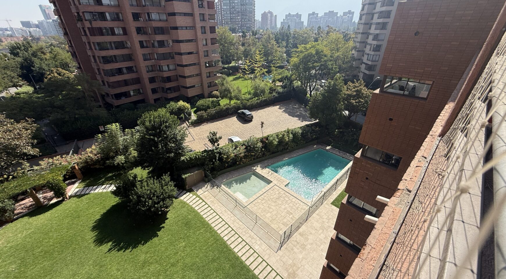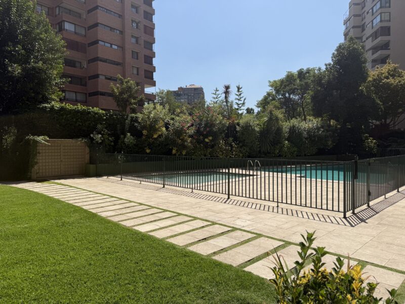 El edificio ofrece piscina, jardines, gimnasio, sala reuniones, salón multiuso; seguridad 24 horas, en un tranquilo sector residencial de Las Condes.