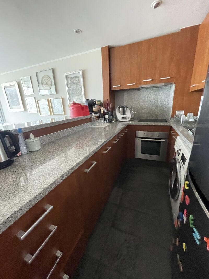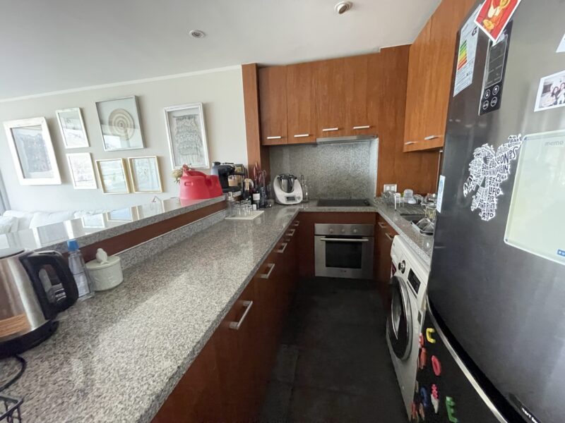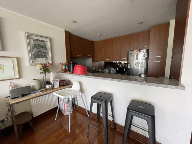 Hall de entrada, living, comedor, cocina americana, 2 dormitorios, 2 baños, principal en suite, terraza. 1 Estacionamiento y bodega. Seguridad las 24 hrs; edificio cuenta con gimnasio, sala multiuso, 2 salas de estudio, piscina, quincho y jardines. GGCC $215.000 app