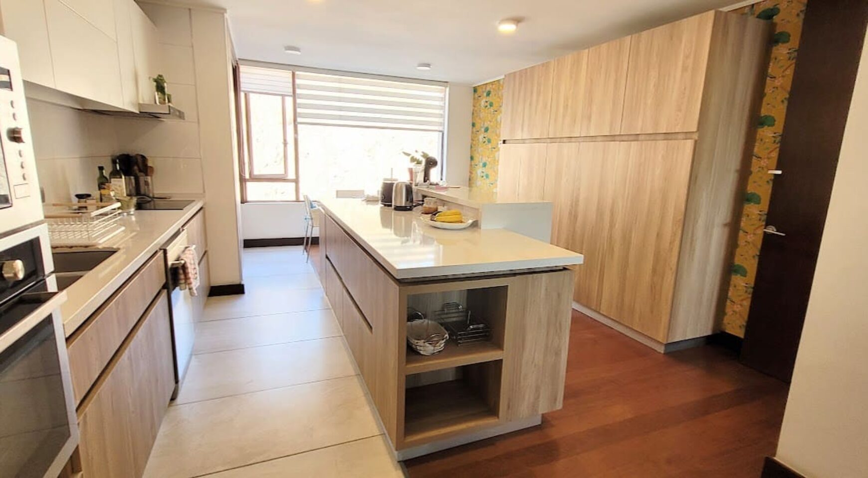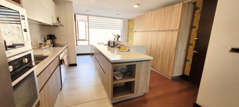Moderna cocina con mesón isla y comedor de diario, logia integrada. La cocina también puede quedar independiente o tipo cocina americana.