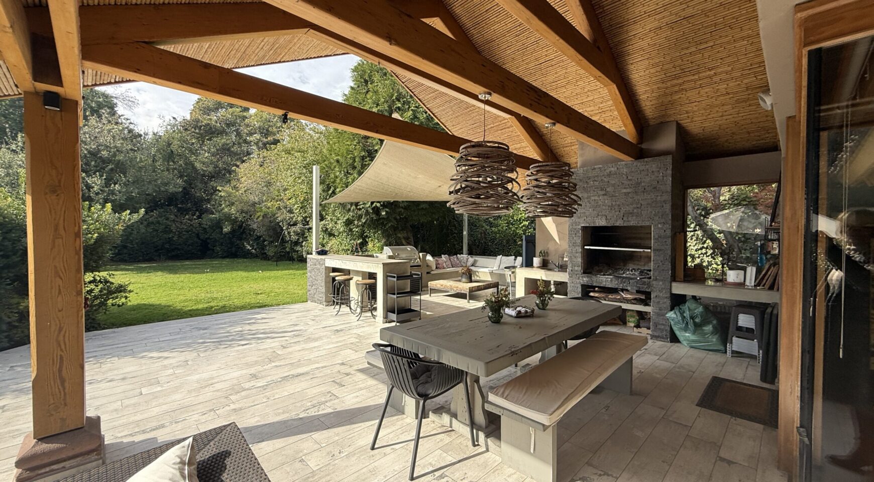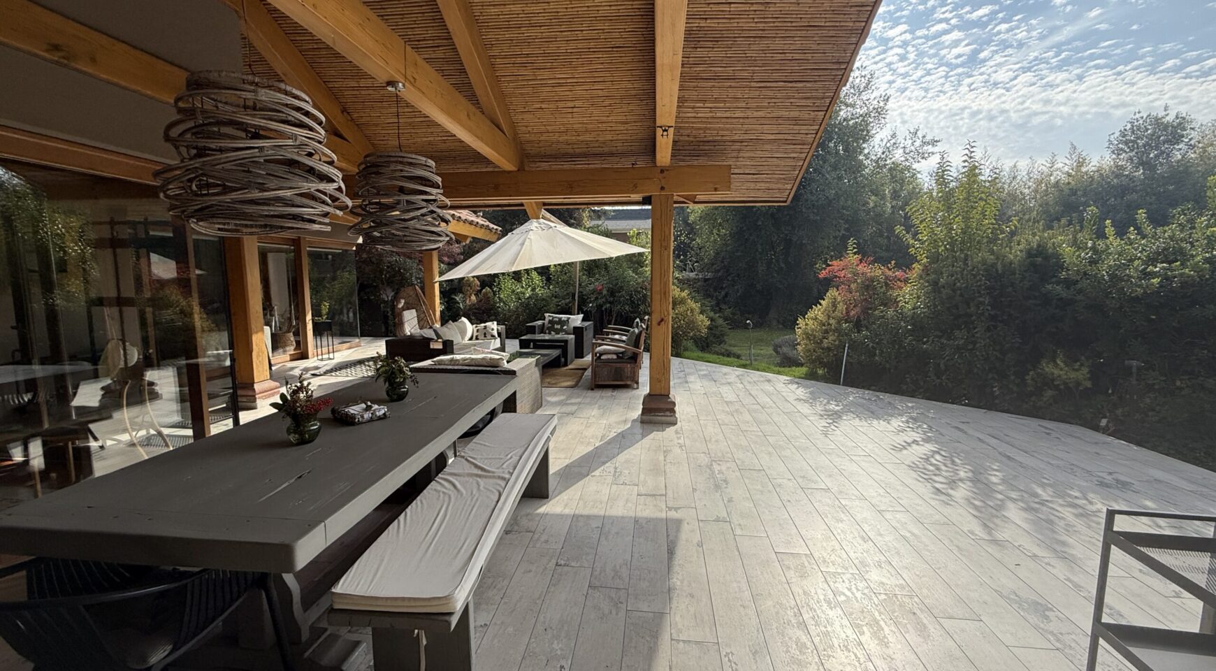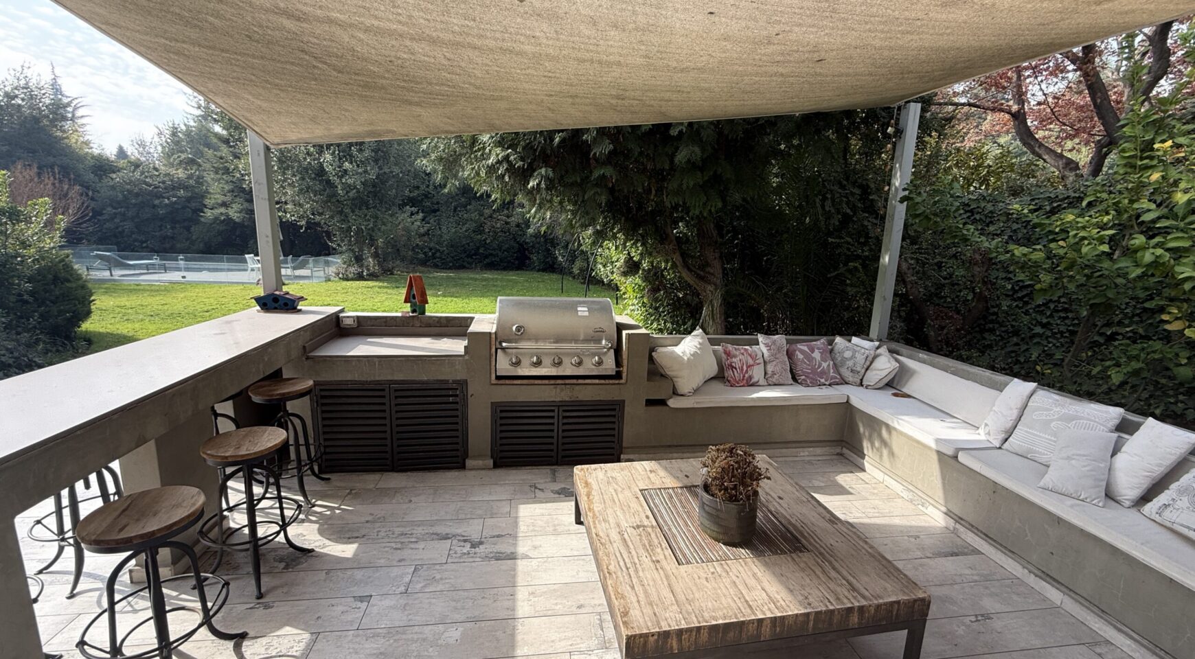 Primer Piso: Amplio hall de entrada, baño de visita, living, comedor, terraza techada, quincho, piscina con calefactor.